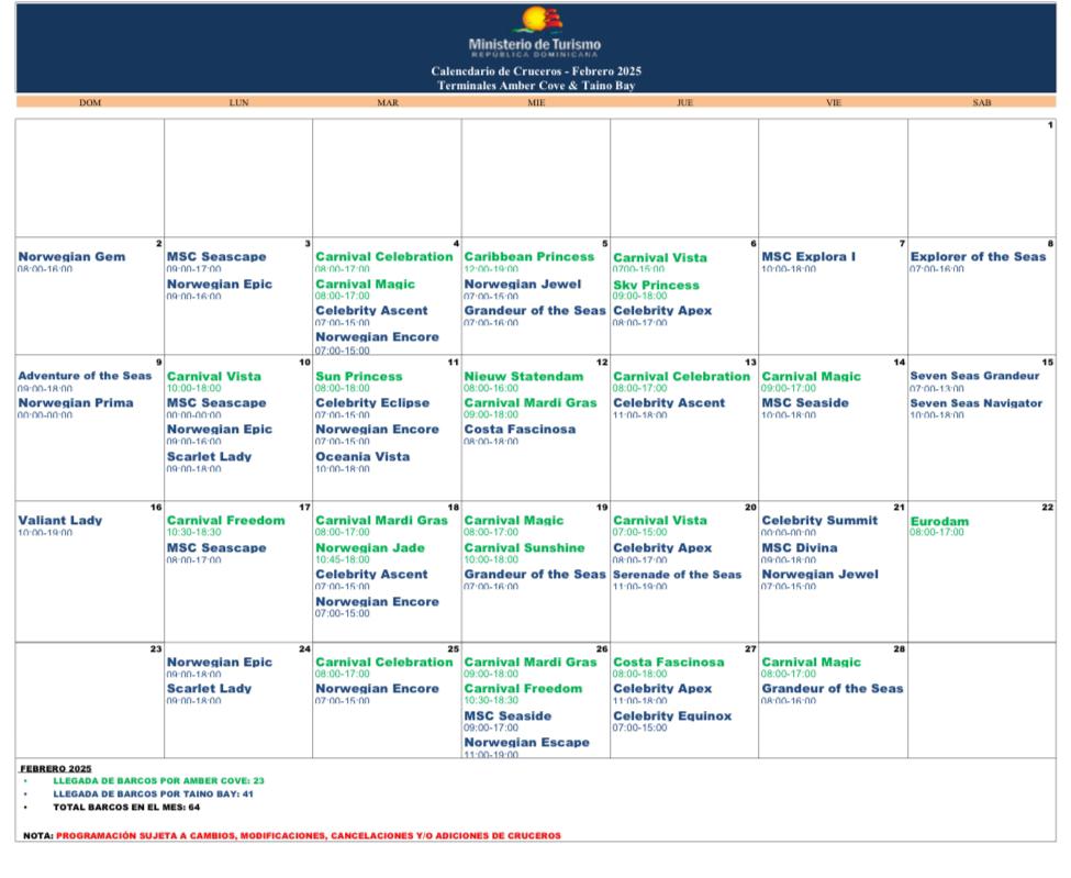 Puerto Plata Tendrá un día de gran actividad turística en febrero de este año 2025, con la aparición de 64 cruceros que llegarán a través del Puertos de Amber Cove y Taino Bay.
